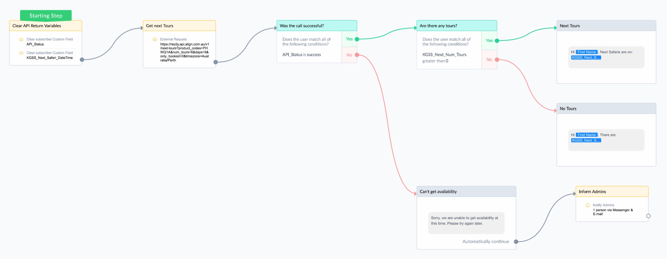 Sample ManyChat Flow showing Next Tours from Rezdy