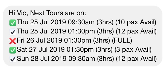 This is especially handy if you work with associated businesses or tourism partners such as visitor centres or caravan parks where they can simply send your messenger page a word like “next” and your next tours are displayed. This helps other businesses promote your tours as they know exactly when you’re going and how many seats are available. This works great for not only customers, but places like caravan parks where they can get the latest bookings availability and write this information up on their notice boards for their customers and help promote your tours.